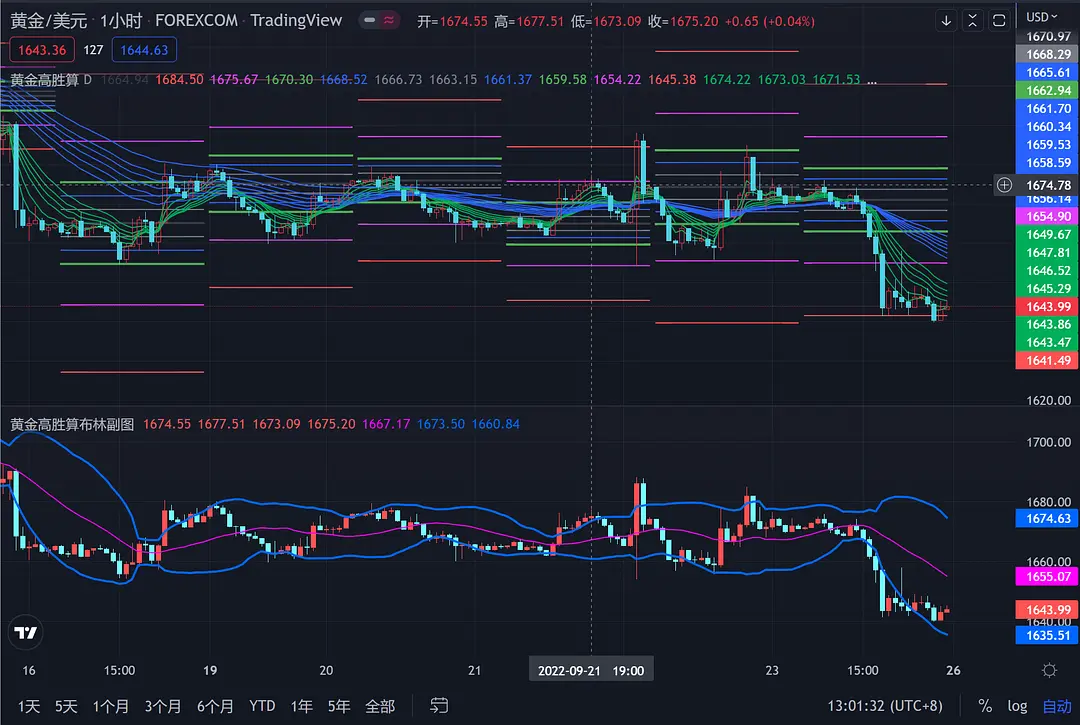 这里使用了 Camarilla Pivot ,没有使用书中的轴心点,效果是一样的。在日线周期中你还可以切换为月轴心点来看。另外布林线叠加到主图影响观看,如果你用黄金高胜算 H4 交易法直接看副图就行了。